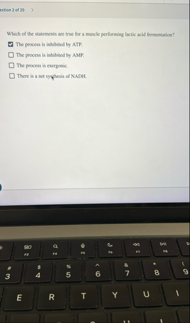 estion 2 of 20 Which of the statements are true for a muscle performing lactic acid fermentation?