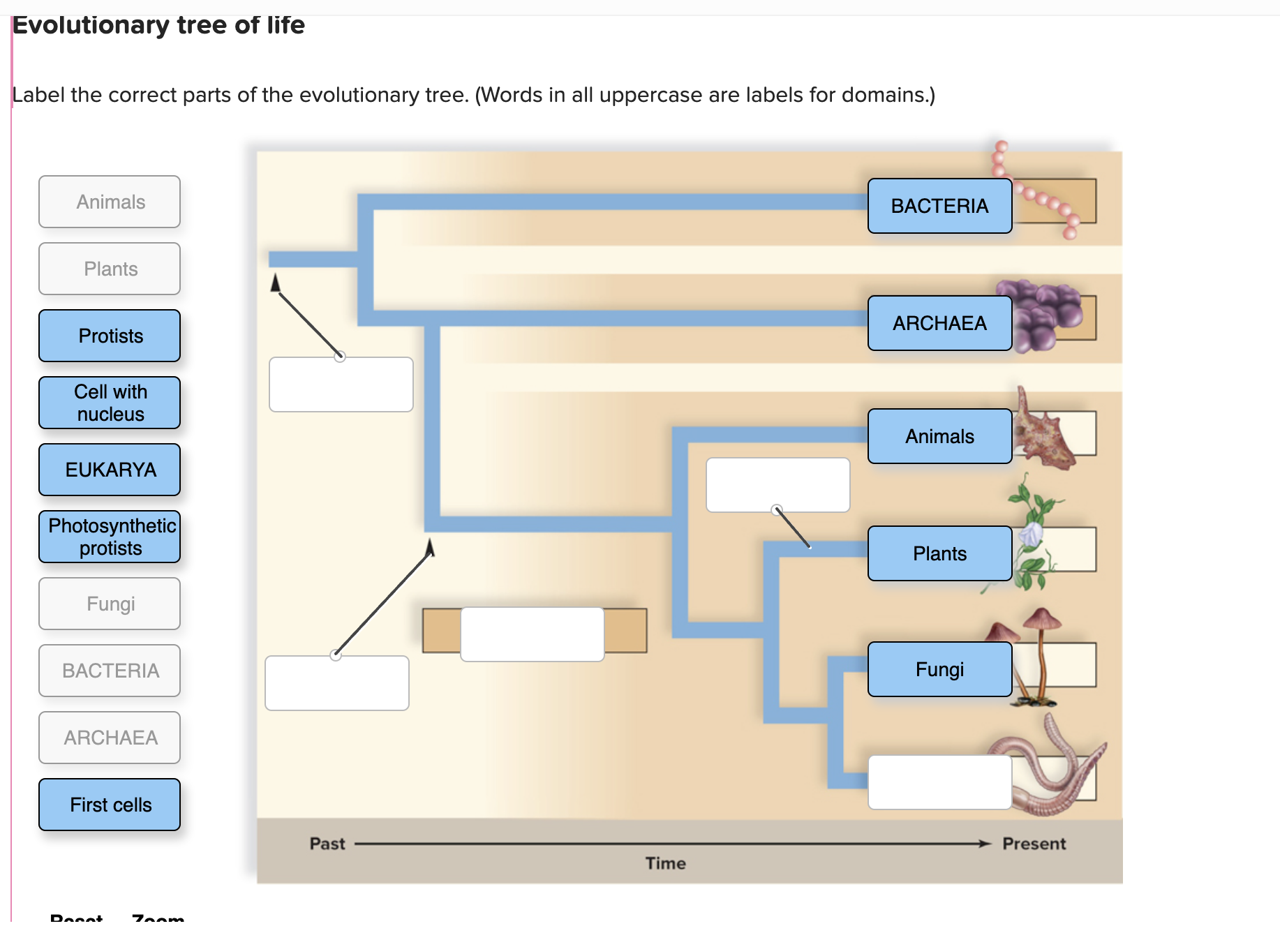 Evolutionary tree of life Label the correct parts of the evolutionary tree. (Words in all uppercase are labels for domains.)