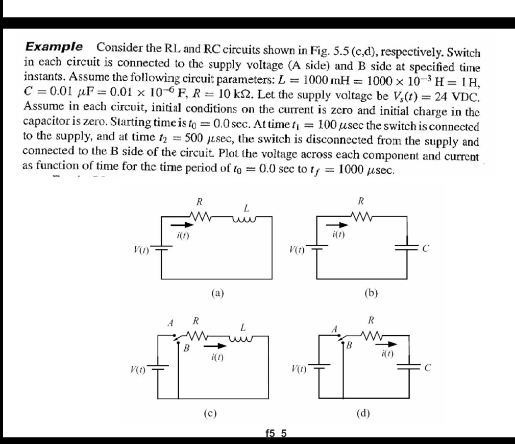 Example Consider the RL and RC circuits shown in Fig. 5.5 (c,d), respectively. Switch in each circuit is connected to the supply voltage (A side) and