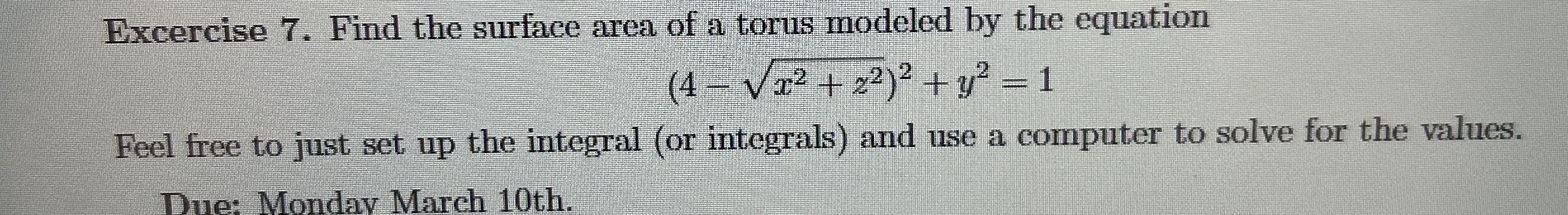 Excercise 7. Find the surface area of a torus modeled by the equation