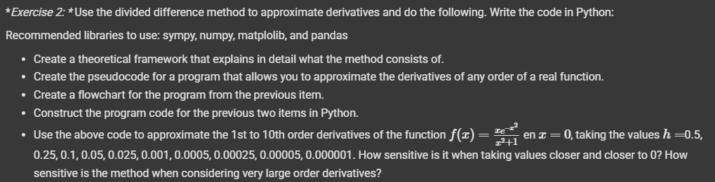 *Exercise 2: *Use the divided difference method to approximate derivatives and do the following. Write the code in Python: