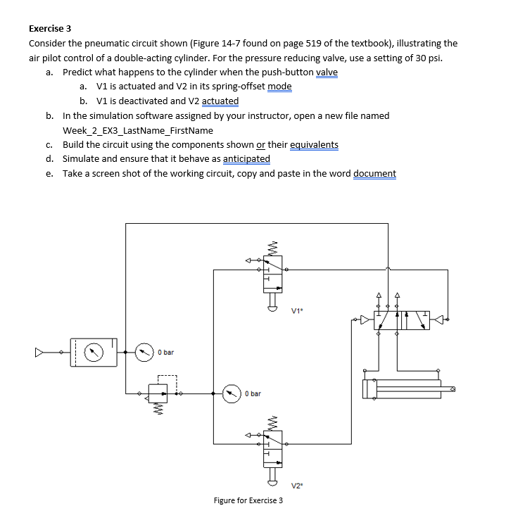 30\psi . a. Predict what happens to the cylinder when the push-button valve a. V1 is actuated and V2 in its spring-offset mode b. V1 is deactivated and V2 actuated b. In the simulation software assigned by your instructor, open a new file named Week_2_EX3_LastName_FirstName c. Build the circuit using the components shown or their equivalents d. Simulate and ensure that it behave as anticipated e. Take a screen shot of the working circuit, copy and paste in the word document Figure for Exercise 3