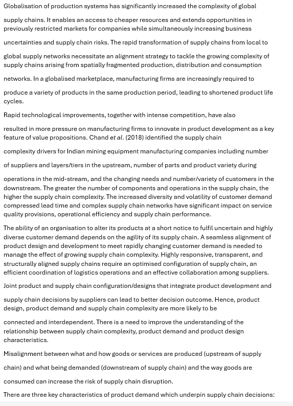 Explain why aligning supply and demand has become a strategic imperative for supply chain success and assess the strategies that organisations can adopt to improve alignment between supply and demand in highly dynamic markets. 20 Marks 2. Discuss the key drivers of supply chain complexity and their effect on demand management. 15 Marks