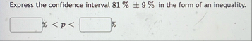(Solved): Express the confidence interval 81% -9% in the form of an inequality. % % ...
