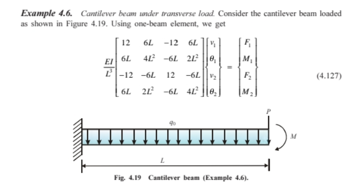 (EI)/(L^(3))[[12,6L,-12,6L],[6L,4L^(2),-6L,2L^(2)],[-12,-6L,12,-6L],[6L,2L^(2),-6L,4L^(2)]]{[v_(1)],[\theta _(1)],[v_(2)],[\theta _(2)]}={[F_(1)],[M_(1)],[F_(2)],[M_(2)]}Fig. 4.19 Cantilever beam (Example 4.6). forces in each element, and the reactions.
