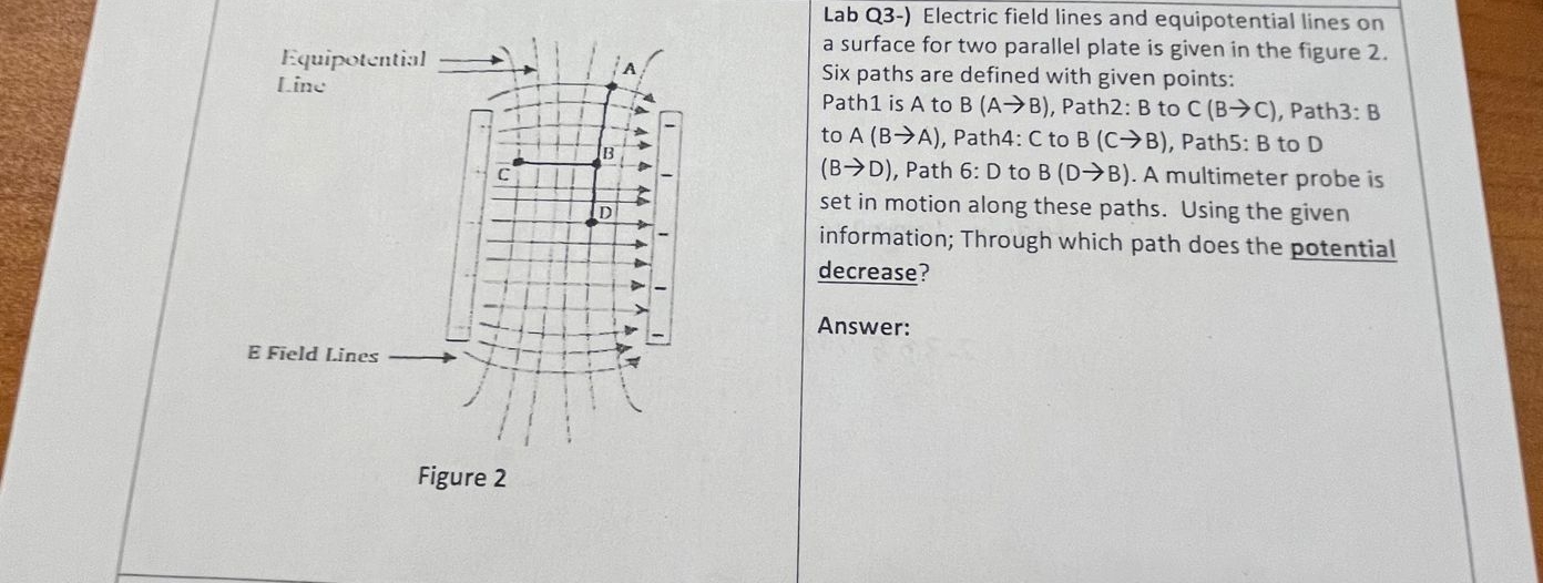 Figure 2 Lab Q3-) Electric field lines and equipotential lines on a surface for two parallel plate is given in the figure 2 . Six paths are defined with given points: Path1 is