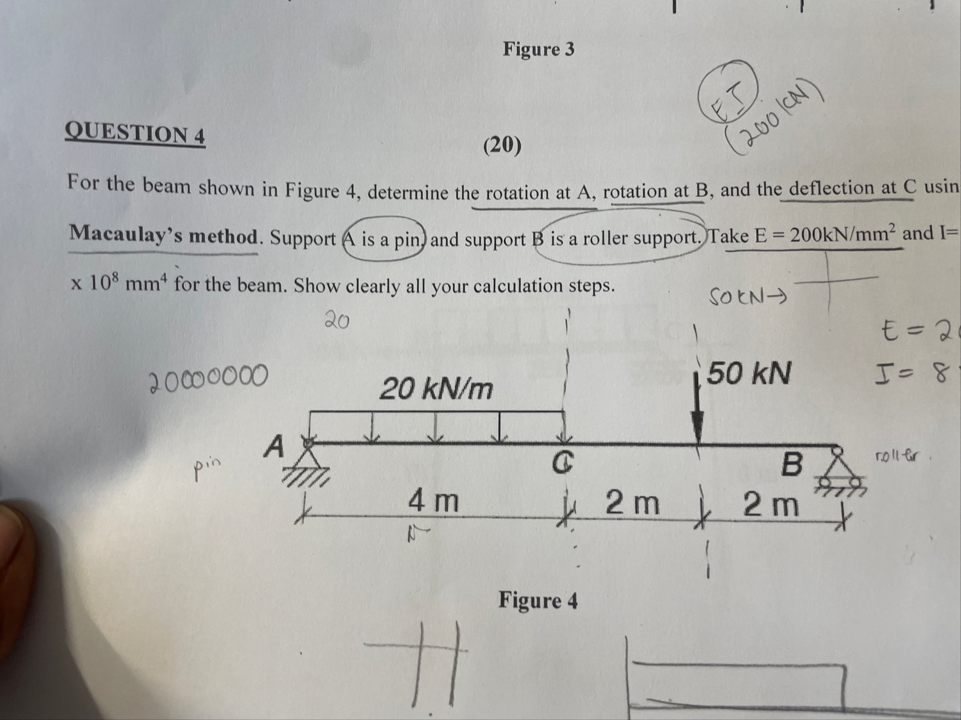Figure 3 QUESTION 4 For the beam shown in Figure 4, determine the rotation at A , rotation at B , and the deflection at C usin Macaulay's method. Support A is a pin. and support B is a roller support. Take