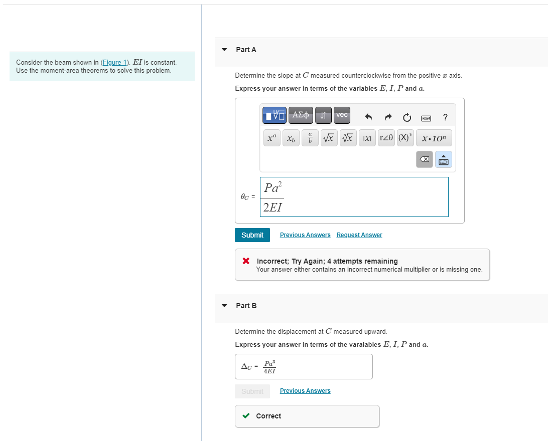 \theta _(C)=Incorrect; Try Again; 4 attempts remaining Your answer either contains an incorrect numerical multiplier or is missing one. Part B Determine the displacement at
