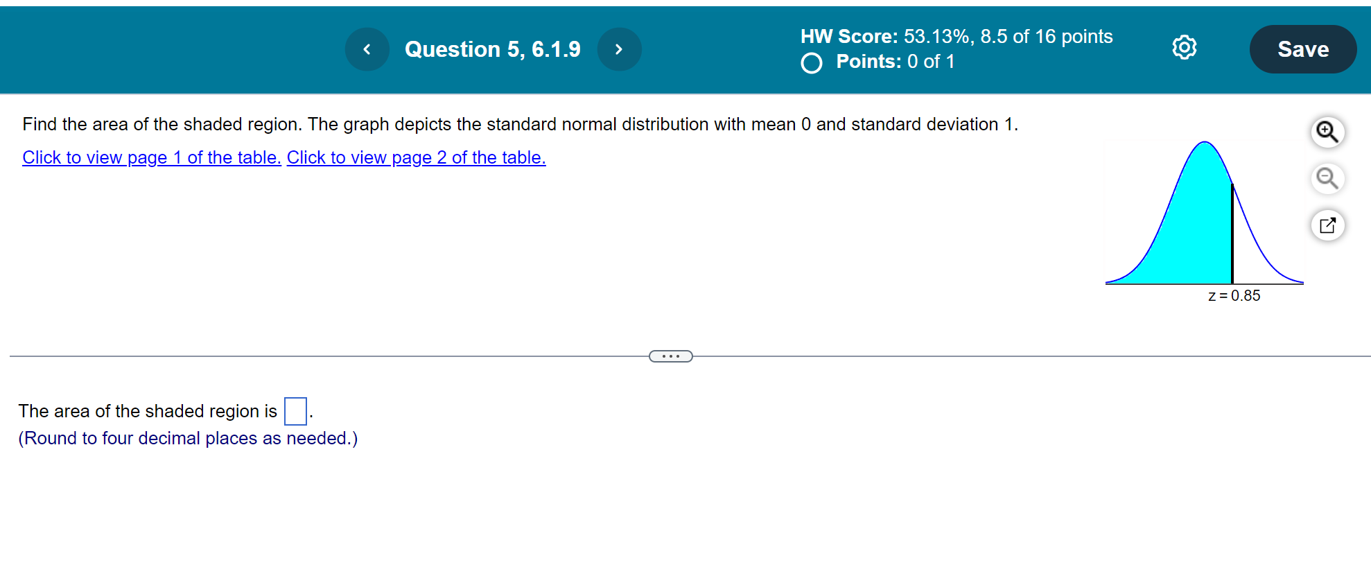 Find the area of the shaded region. The graph depicts the standard normal distribution with mean 0 and standard deviation 1 . Click to view page 1 of the table. Click to view page 2 of the table. The area of the shaded region is (Round to four decimal places as needed.)
