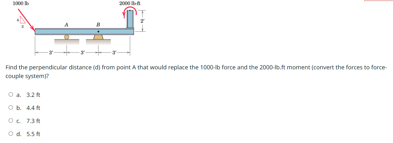 Find the perpendicular distance (d) from point A that would replace the 1000 -lb force and the 2000 -lb.ft moment (convert the forces to force-