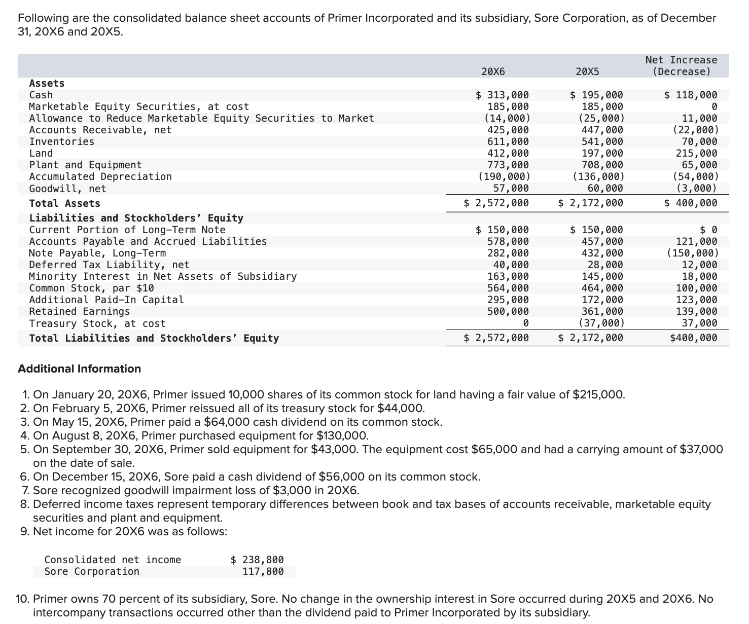 Following are the consolidated balance sheet accounts of Primer Incorporated and its subsidiary, Sore Corporation, as of December