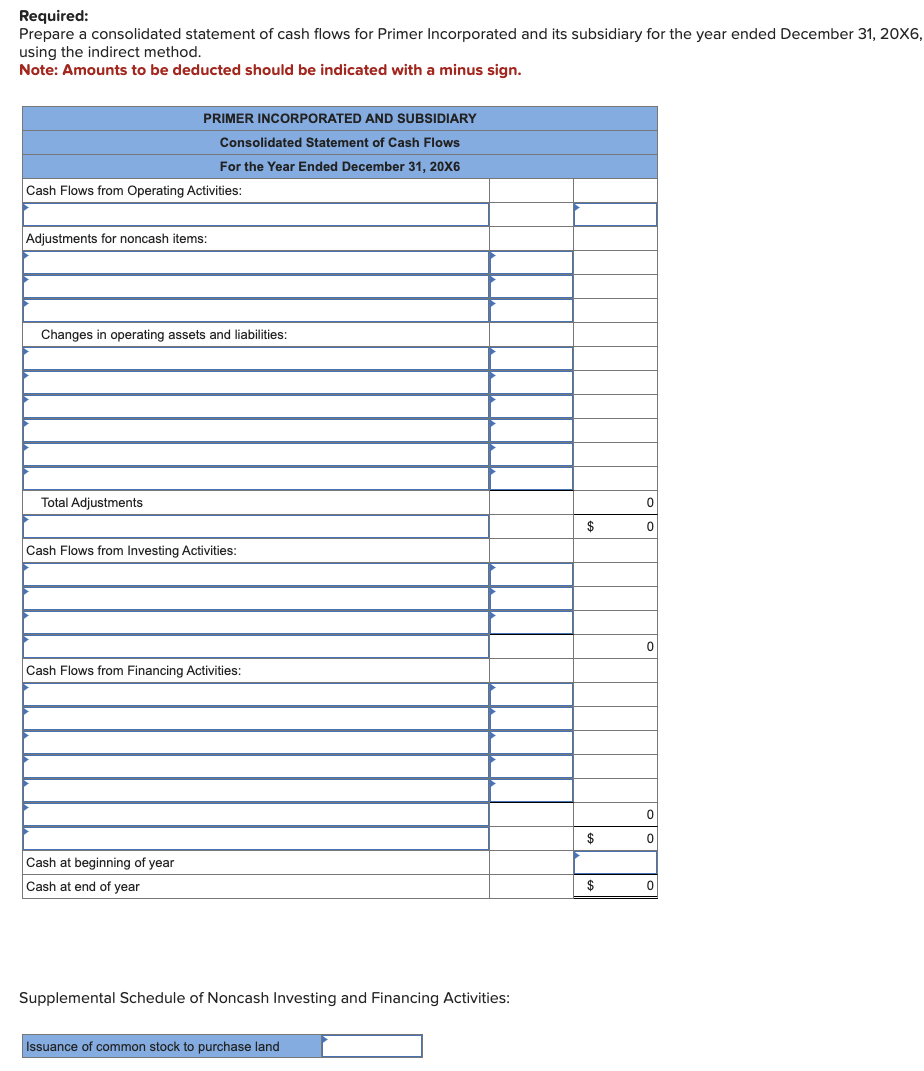 Sore Corporation 117,800Primer owns 70 percent of its subsidiary, Sore. No change in the ownership interest in Sore occurred during 20X5 and 20X6. No intercompany transactions occurred other than the dividend paid to Primer Incorporated by its subsidiary.Required: Prepare a consolidated statement of cash flows for Primer Incorporated and its subsidiary for the year ended December 31, 20X6, using the indirect method. Note: Amounts to be deducted should be indicated with a minus sign. Supplemental Schedule of Noncash Investing and Financing Activities: