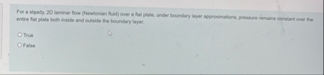 For a steady, 20 laminar flow (Newtonian fuid) over a flat plate, under boundary layer approvimations, presture remains conatart over the ertire fat plate both inside and outside the boundary layer.