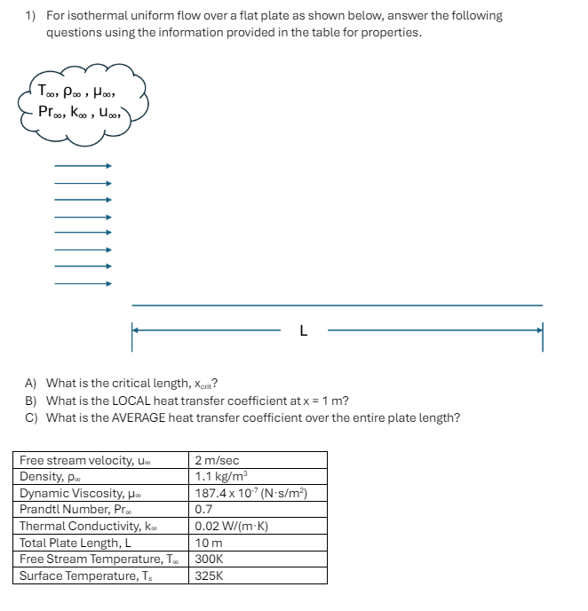 For isothermal uniform flow over a flat plate as shown below, answer the following questions using the information provided in the table for properties. A) What is the critical length,