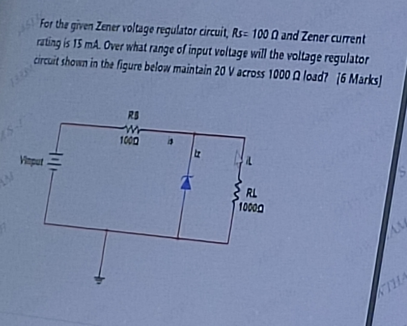 . Over what range of input voltage will the voltage regulator circuit shown in the figure below maintain 20 V across