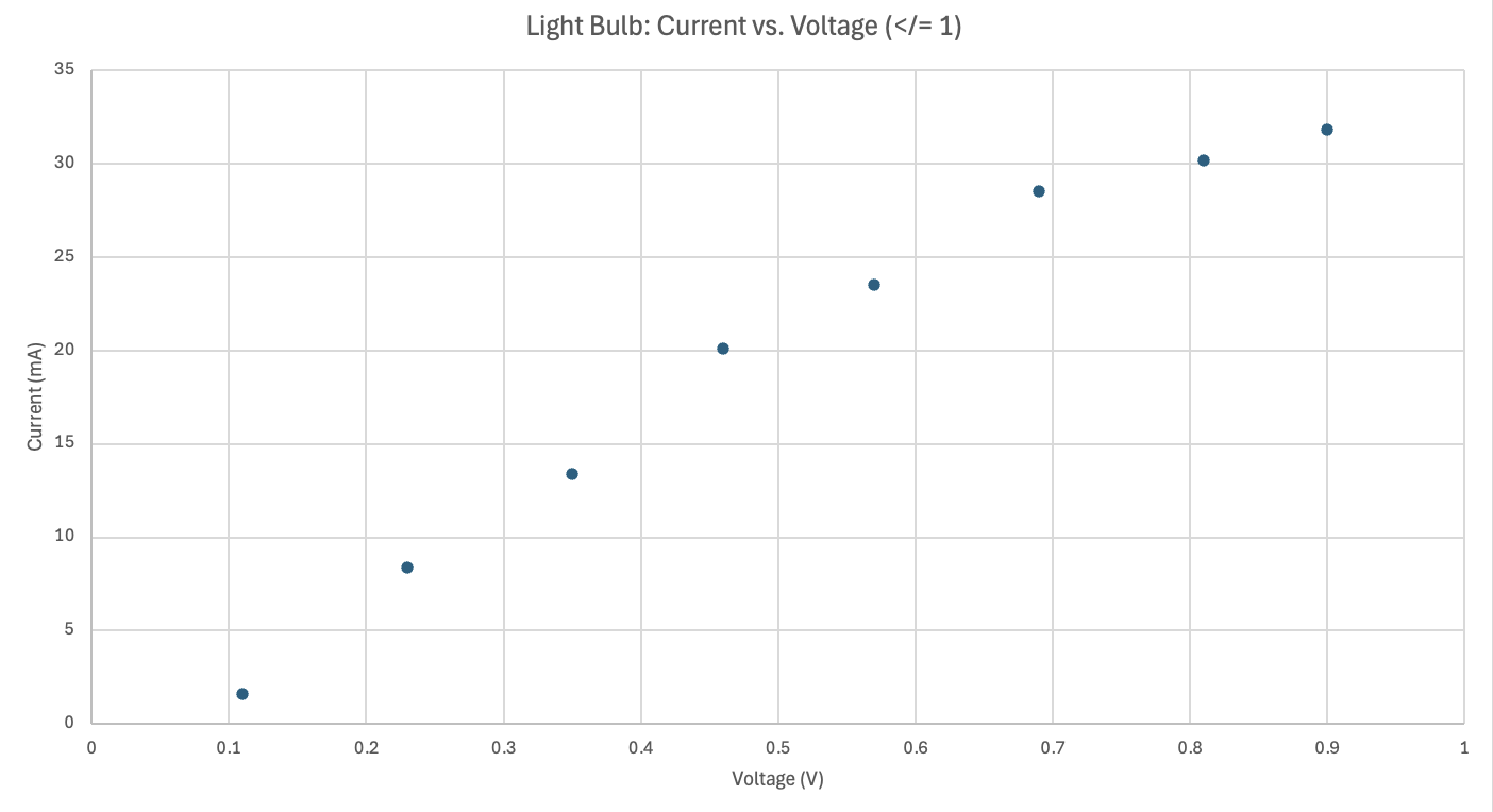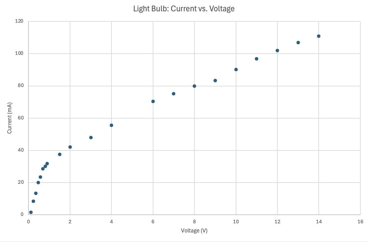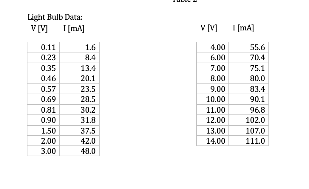 For the light bulb, Light Bulb: Current vs. Voltage a. Using the data supplied, plot the current vs. voltage. This will not be a straight line. b. It is unlikely that you will find a trendline that will be a good match to your data. Print out the graph (points only) and hand-draw (or use a French curve) the best fit curve. c. Also do a second graph. This graph will use only the data that is <=1.0 V. Use this graph to draw a tangent to the curve at the origin. Additional gridlines will be useful for calculating the slope of the tangent line. d. From the slope of the tangent at the origin, find the cold resistance of the bulb. e. Use Ohm’s Law and your maximum voltage/current readings to find the hot resistance of the bulb. f. Determine the operating temperature of the light bulb. g. Although sources vary, a common value for the operating temperature of a tungsten filament i s 2700 K. Compare this (% error) with your calculated temperature. This lab is completely online so i do not have access to any measuring equipment (aka cannot connect lightbulb to multimeter) f Light Bulb: Current vs. Voltage (or cold resistance. All tables and data are provided in the images attached. I really need help with c-g. please show all steps in detail, I will rate