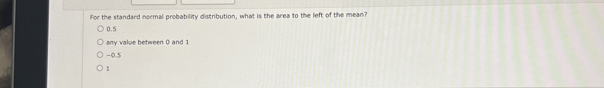 For the standard normal probability distribution, what is the area to the left of the mean? 0.5 any value between 0 and 1