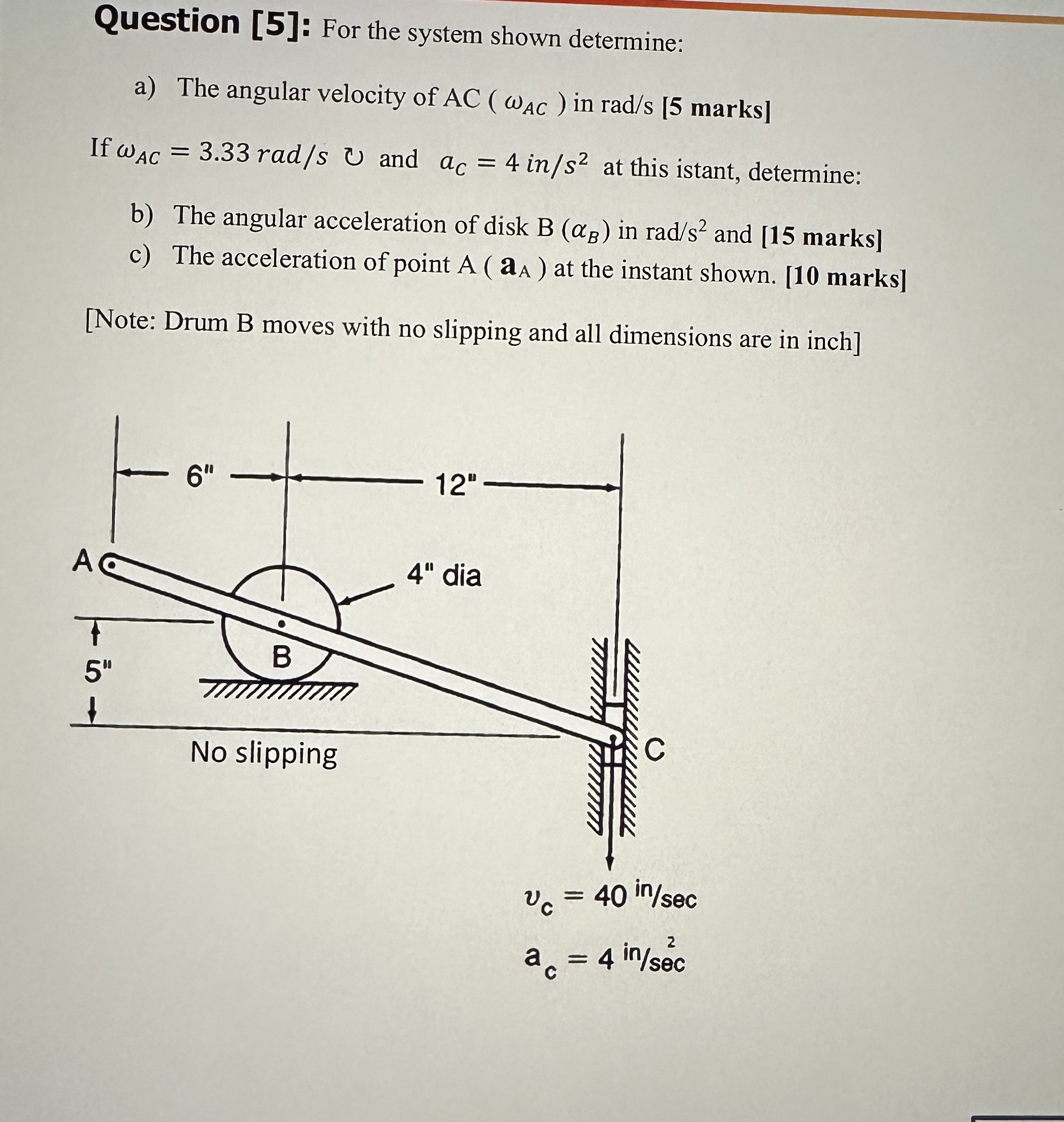 A(a_(A))at the instant shown. [10 marks] [Note: Drum B moves with no slipping and all dimensions are in inch]