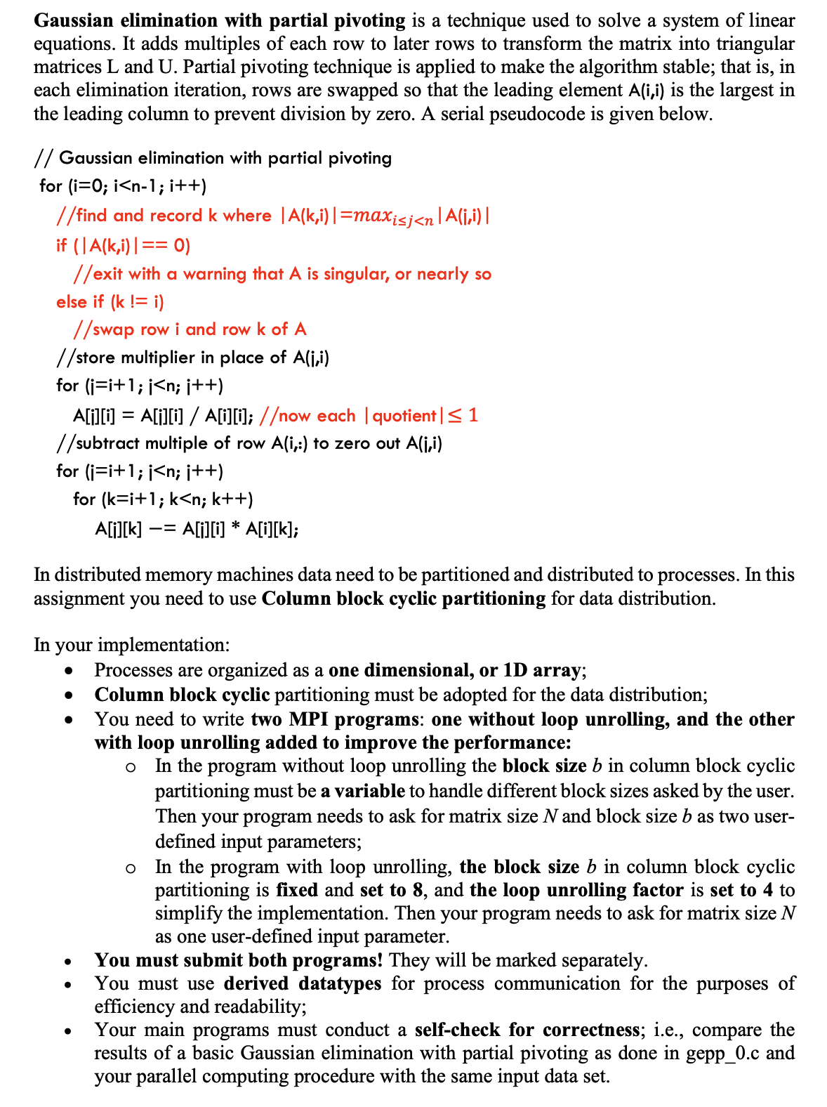 A(i,i)is the largest in the leading column to prevent division by zero. A serial pseudocode is given below. In distributed memory machines data need to be partitioned and distributed to processes. In this assignment you need to use Column block cyclic partitioning for data distribution. In your implementation: Processes are organized as a one dimensional, or 1D array; Column block cyclic partitioning must be adopted for the data distribution; You need to write two MPI programs: one without loop unrolling, and the other with loop unrolling added to improve the performance: In the program without loop unrolling the block size