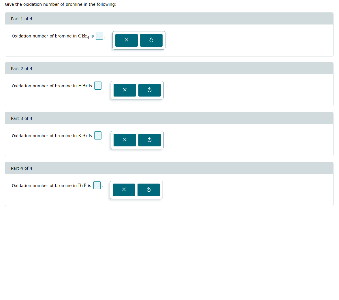 Give the oxidation number of bromine in the following: Part 1 of 4 Oxidation number of bromine in \( \mathrm{CBr}_{4} \) is Part 2 of 4 Oxidation number of bromine in HBr is Part 3 of 4 Oxidation number of bromine in KBr is Part 4 of 4 Oxidation number of bromine in BrF is