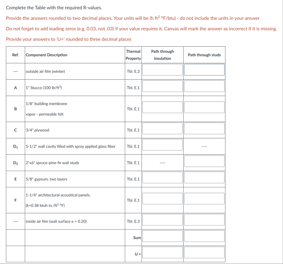 ' rounded to three decimal places \table[[Ref.,Component Description,\table[[Thermal],[Property]],Path through insulation,Path through studs],[---,outside air film (winter),Tbl. E. 3,,],[A,