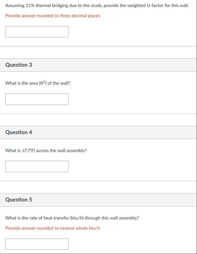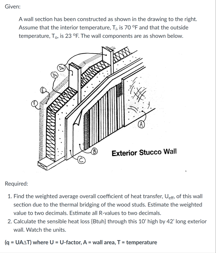 , of this wall section due to the thermal bridging of the wood studs. Estimate the weighted value to two decimals. Estimate all R-values to two decimals. Calculate the sensible heat loss {Btuh} through this 10' high by