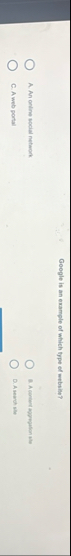 Google is an example of which type ef wrosilue? A. An online social network: 8. A cerrert appropion aise C. A web portur B A seaval side