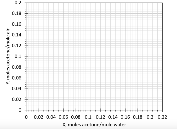 Graphical Analysis of Absorption and Stripping 1. (40 points) Absorption of acetone from air. 95% of the acetone vapor in an 85vol% air stream is to be absorbed by countercurrent contact with pure water in a valve-tray column. The feed gas flow rate is 100kmol/h. The column will operate at 20?C and 101kPa. Equilibrium data for acetone-water at these conditions are as follows: a. (10 pts) Make a plot of the equilibrium curve (use mole ratios instead of mole fractions). You can make a plot in Excel/another software or draw the curve by hand using the grids provided in Figure 1 on the next page. Make sure to write down your calculations. b. (10 pts) Determine the minimum value of L?/V? graphically. c. (15 pts) Determine the total number of equilibrium stages using a value of L?/V? of 1.25 times the minimum. d. (5 pts) Determine the concentration of acetone in the exit water.