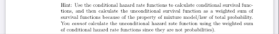 Hint: Use the conditional hazard rate functions to calculate cooditional survival funethons, asd thes calculate the unconditional survival function as a welghted sum of survival functions because of the property of micture model/law of total probalility. You cannot calculate the unconditional hazard rate function using the weighted sum of conditional hazard rate functioes since they are not probabilities).