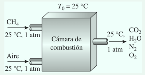 Hola podrian ayudarme a resolver el siguiente problema por favor Análisis de combustión isotérmica con base en la segunda ley. A una cámara de combustión de flujo estacionario entra gas metano (CH4) a 25 °C y 1 atm y se quema con 50 por ciento de exceso de aire, el cual también entra a 25 °C y 1 atm, como se ilustra en la figura. Después de la combustión se deja que los productos se enfríen hasta 25 °C. Tomando en cuenta que es una combustión completa, determine: a) la transferencia de calor por kmol de CH4 b) la generación de entropía c) el trabajo reversible y la destrucción de exergía. Considere que T0 = 298 K y que los productos abandonan la cámara de combustión a una presión de 1 atm.
