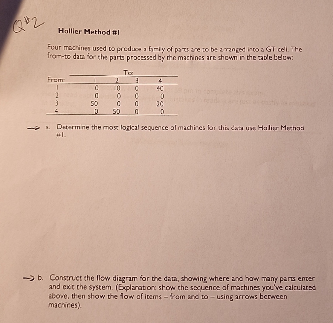 Hollier Method #I Four machines used to produce a family of parts are to be arranged into a GT cell. The from-to data for the parts processed by the machines are shown in the table below: \table[[,To:],[From:,1,2,3,4],[1,0,10,0,40],[2,0,0,0,0],[3,50,0,0,20],[4,0,50,0,0]] a. Determine the most logical sequence of machines for this data use Hollier Method #I.