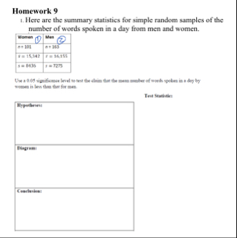Here are the summary statistics for simple random samples of the number of words spoken i ...