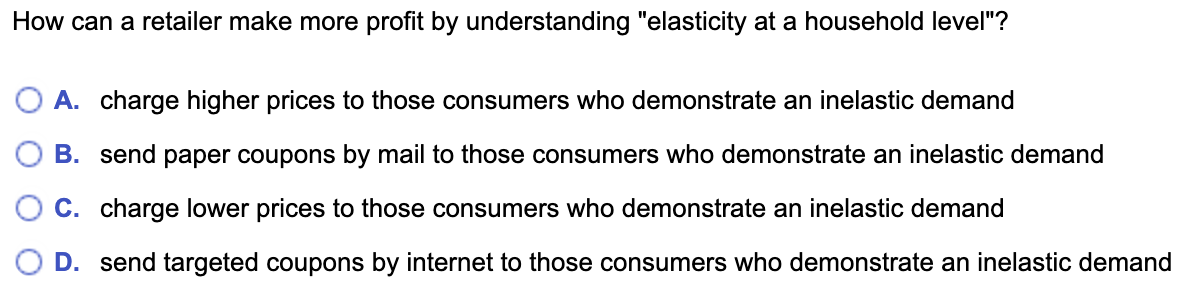 How can a retailer make more profit by understanding "elasticity at a household level"? A. charge higher prices to those consumers who demonstrate an inelastic demand B. send paper coupons by mail to those consumers who demonstrate an inelastic demand C. charge lower prices to those consumers who demonstrate an inelastic demand D. send targeted coupons by internet to those consumers who demonstrate an inelastic demand