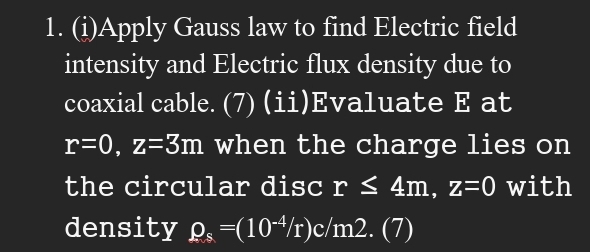 (i)Apply Gauss law to find Electric field intensity and Electric flux density due to coaxial cable. (7) (ii)Evaluate E at