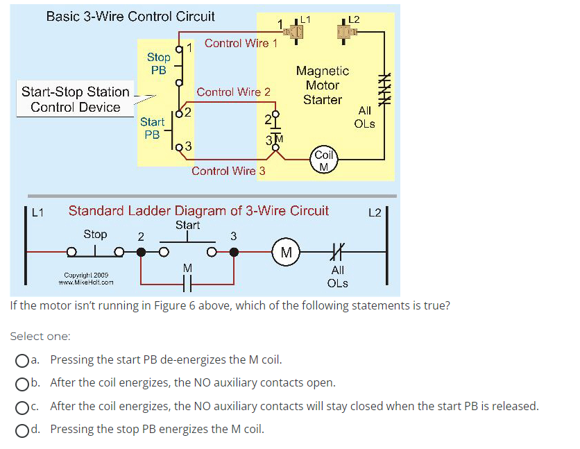 I L1 Standard Ladder Diagram of 3-Wire Circuit L2 I It the motor ?sn't runn?ng in F?gure 6 above, wh?ch of the tollowing statements is true? Select one: a. Pressing the start PB de-energizes the M coil. b. After the coil energizes, the NO auxiliary contacts open. c. After the coil energizes, the NO auxiliary contacts will stay closed when the start PB is released. d. Pressing the stop PB energizes the