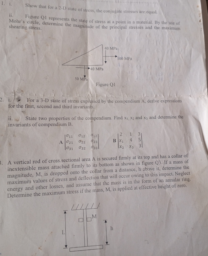 i. Show that for a 2-D state of stress, the conjugate stresses are equal. ii. Figure Q1 represents the state of stress at a point in a material. By the use of Mohr's circle, determine the magnitude of the principal stresses and the maximum shearing stress. i. For a 3-D state of stress expressed by the compendium A, derive expressions for the first, second and third invariants. ii. State two properties of the compendium. Find