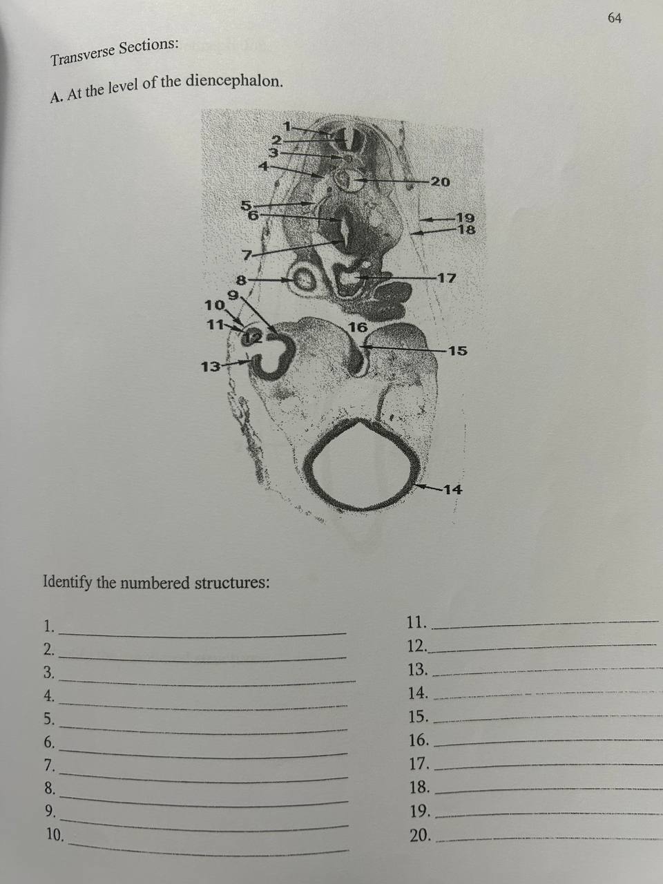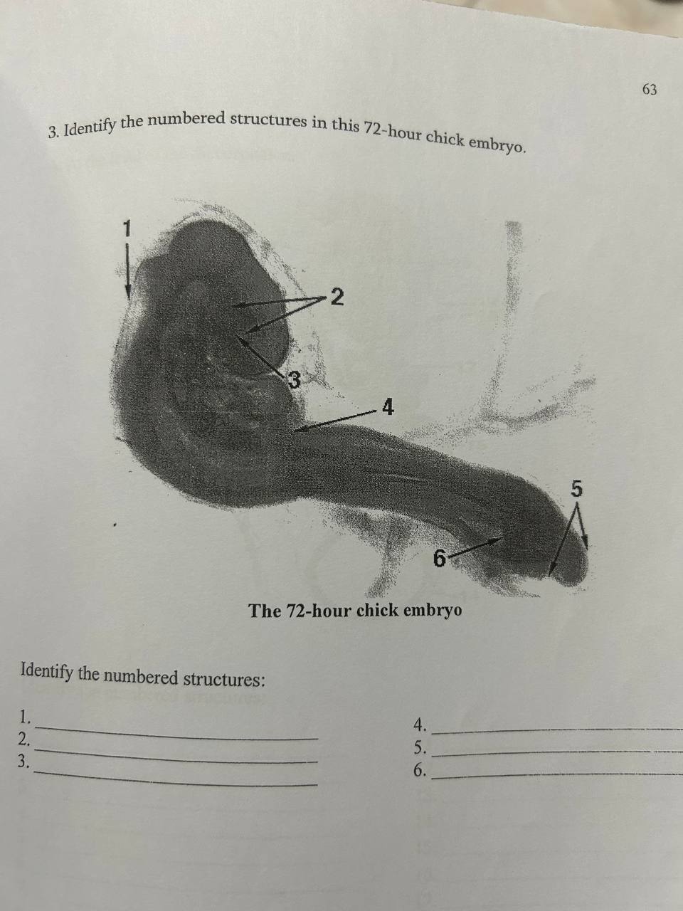 Identify the numbered structures of the 72 -hour chick embryo. The 72-hour chick embryo Identify the numbered structures 9 .Whole Mount: Identify the pointed structures in the whole mount of the 72-hour chick embryo. Identify the numbered structures in this 72 -hour chick embryo. Identify the numbered structures: Transverse Sections: A. At the level of the diencephalon. Identify the numbered structures: