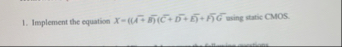 (Solved): Implement the equation x=((A^(4) B)(/bar (C^(2))( )/(b)ar (D^(2)) E) F)C^(2) using static CMOS. ...