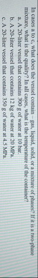 In cases a to c, what does the vessel contain - gas, liquid, solid, or a mixture of phases? If it is a two-phase mixture, what is the quality? In all cases, what is the temperature of the container? a. A 20 -liter vessel that contains 300 g of water at 10 bar. b. A 20 -liter vessel that contains 12 kg of water at 20 MPa . c. A 20-liter vessel that contains 350 g of water at 4.5 MPa .