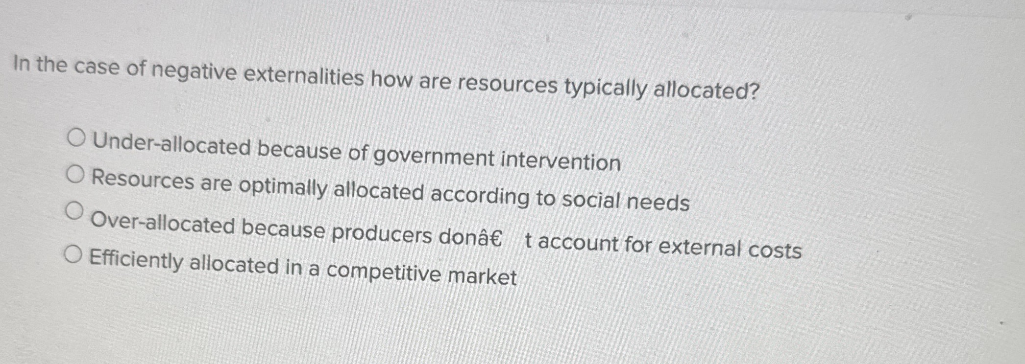 In the case of negative externalities how are resources typically allocated? Under-allocated because of government intervention Resources are optimally allocated according to social needs Over-allocated because producers don†t account for external costs Efficiently allocated in a competitive market