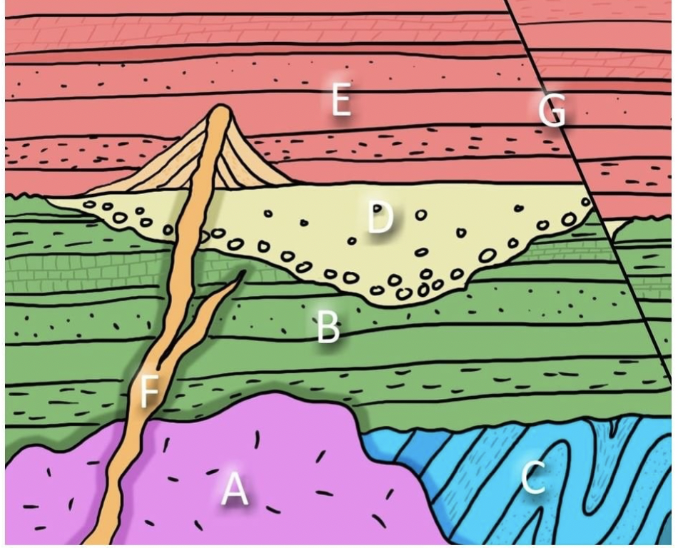 In the diagram below, put the sequence of lettered events in order, from oldest to youngest. - List them in chronological order with the oldest first, and youngest last. Indicate which laws you used to help you tell the correct sequence.
