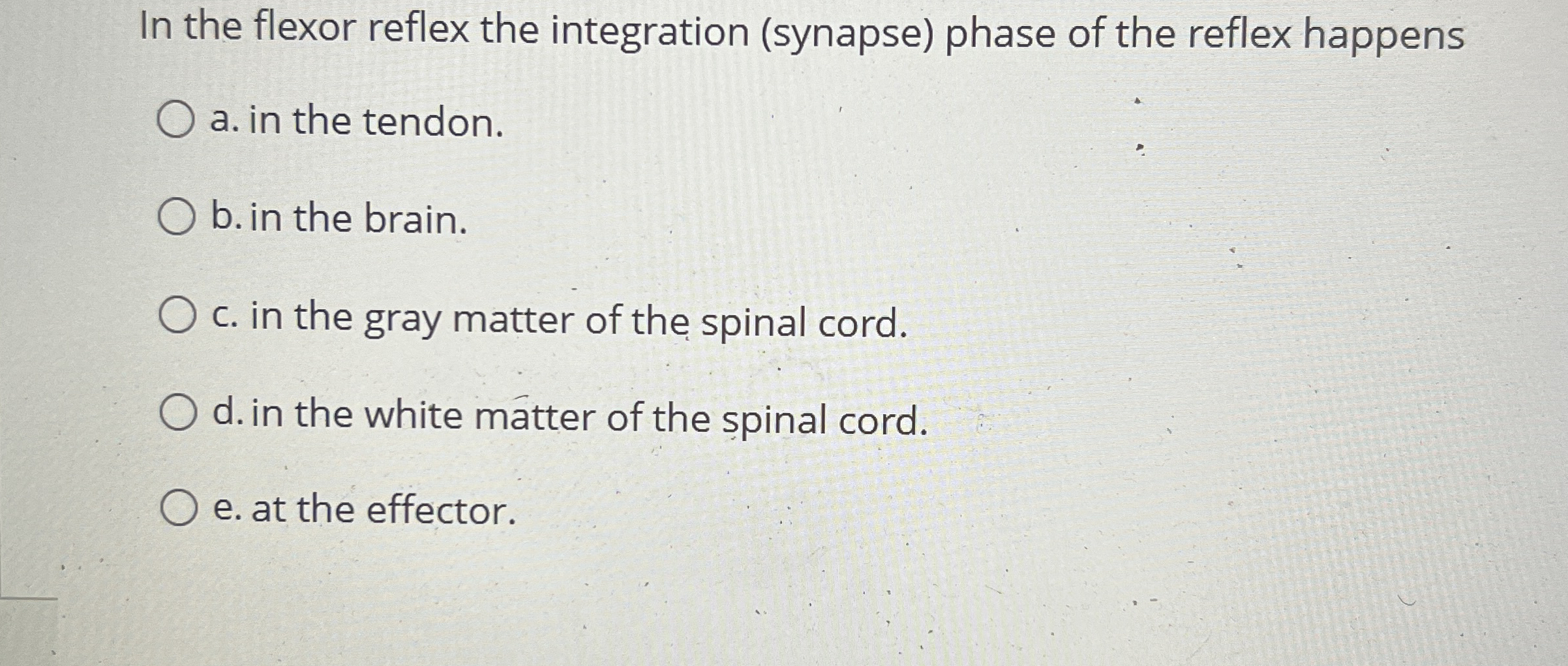 (Solved): In the flexor reflex the integration (synapse) phase of the reflex happens