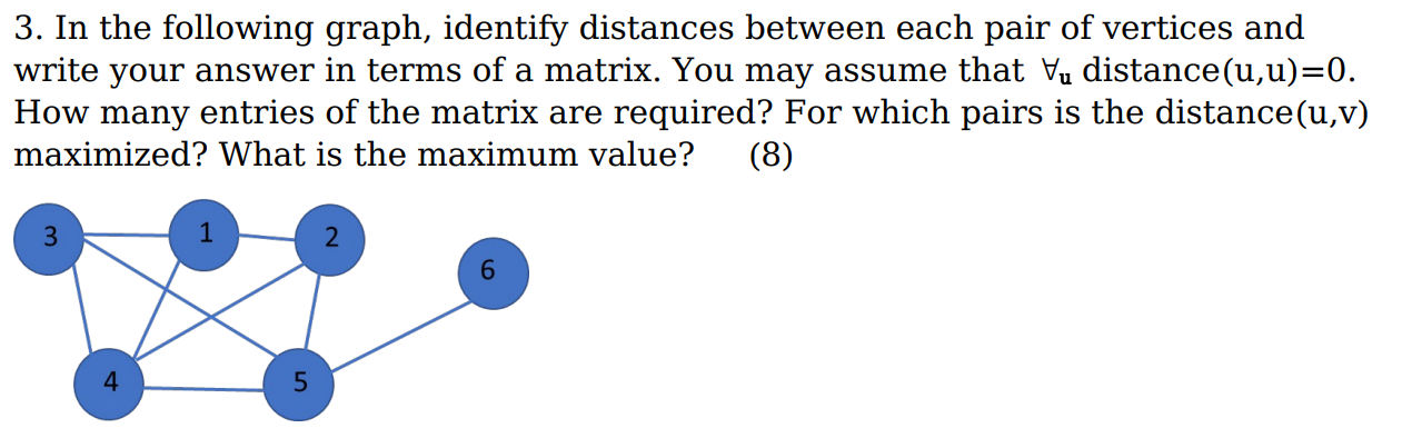 In the following graph, identify distances between each pair of vertices and write your answer in terms of a matrix. You may assume that