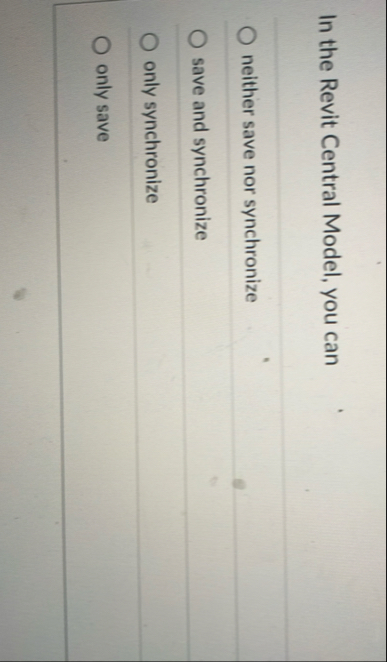 In the Revit Central Model, you can neither save nor synchronize save and synchronize only synchronize only save A structural element that carries a load that is applied transverse (perpendicular) to its length is generally a Arch Beam Keystone Column