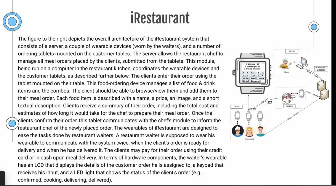 iRestaurant (Draw use-case diagram, statechart diagram, There must be a use-case of the software system described above that captures a scenario in which a customer whose name is Jennifer successfully places a meal order. Draw a sequence diagram for this use-case. There must be a use-case of the software system described above that captures a scenario in which a customer whose name is Jennifer successfully places a meal order. Give a tabular representation of this use-case. Make sure you follow one of the use-case templates you learned in the lecture.) Please give propriate diagram, the previous expert failed to give the diagram via image and i can not view it.