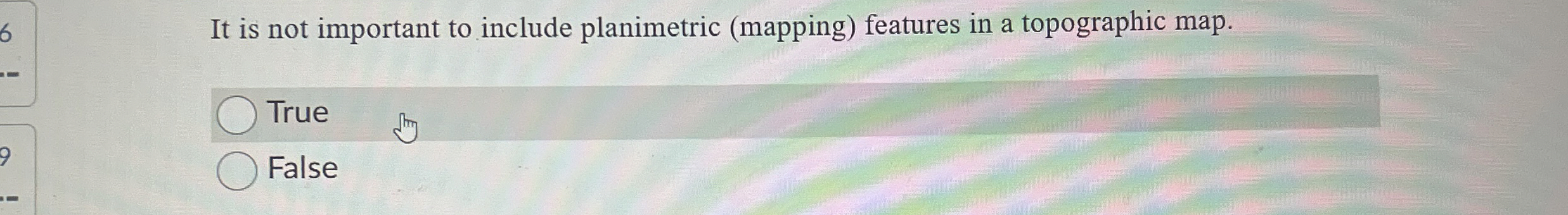 (Solved): It is not important to include planimetric (mapping) features in a topographic map. True Fal ...