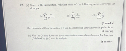 L2. (a) State, with justification, whether each of the following series converges or diverges. (i)