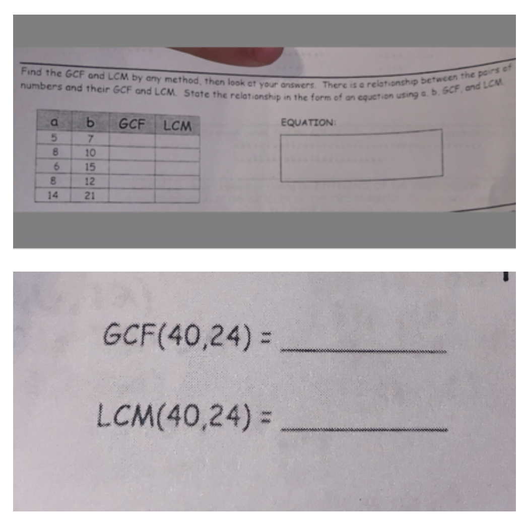 b,GCF,LCM],[5,7,,],[8,10,,],[6,15,,],[8,12,,],[14,21,,]] EOUATION: 2.) GCF (40,24) LCM (40,24)
