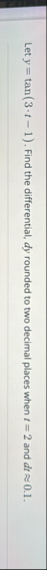 / let-y-tan-3-t-1-find-the-differential-dy-rounded-to-two-decimal-places-when-t-2-and-dt-0-1-pa939