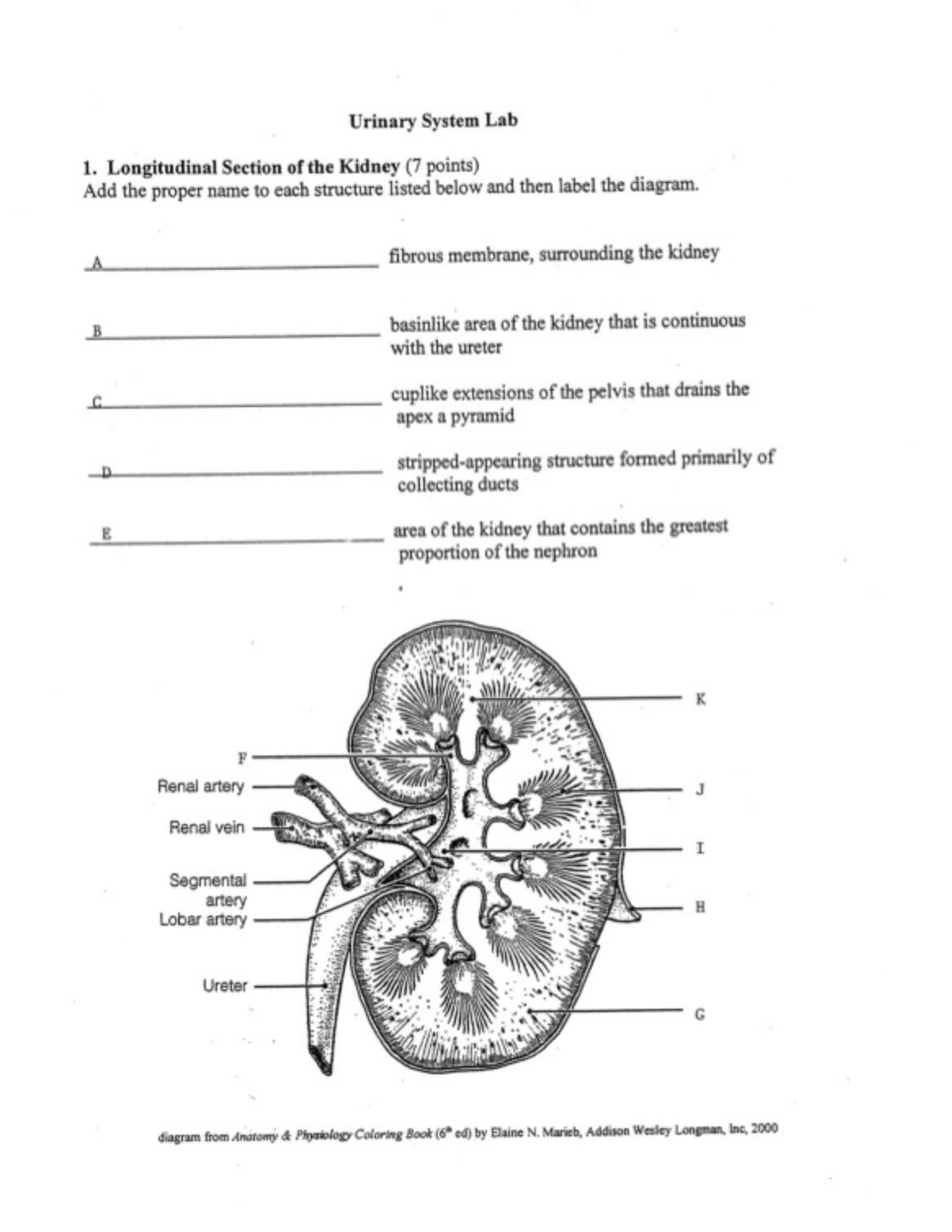 Longitudinal Section of the Kidney Add the proper name to each structure listed below and then label the diagram F-K.